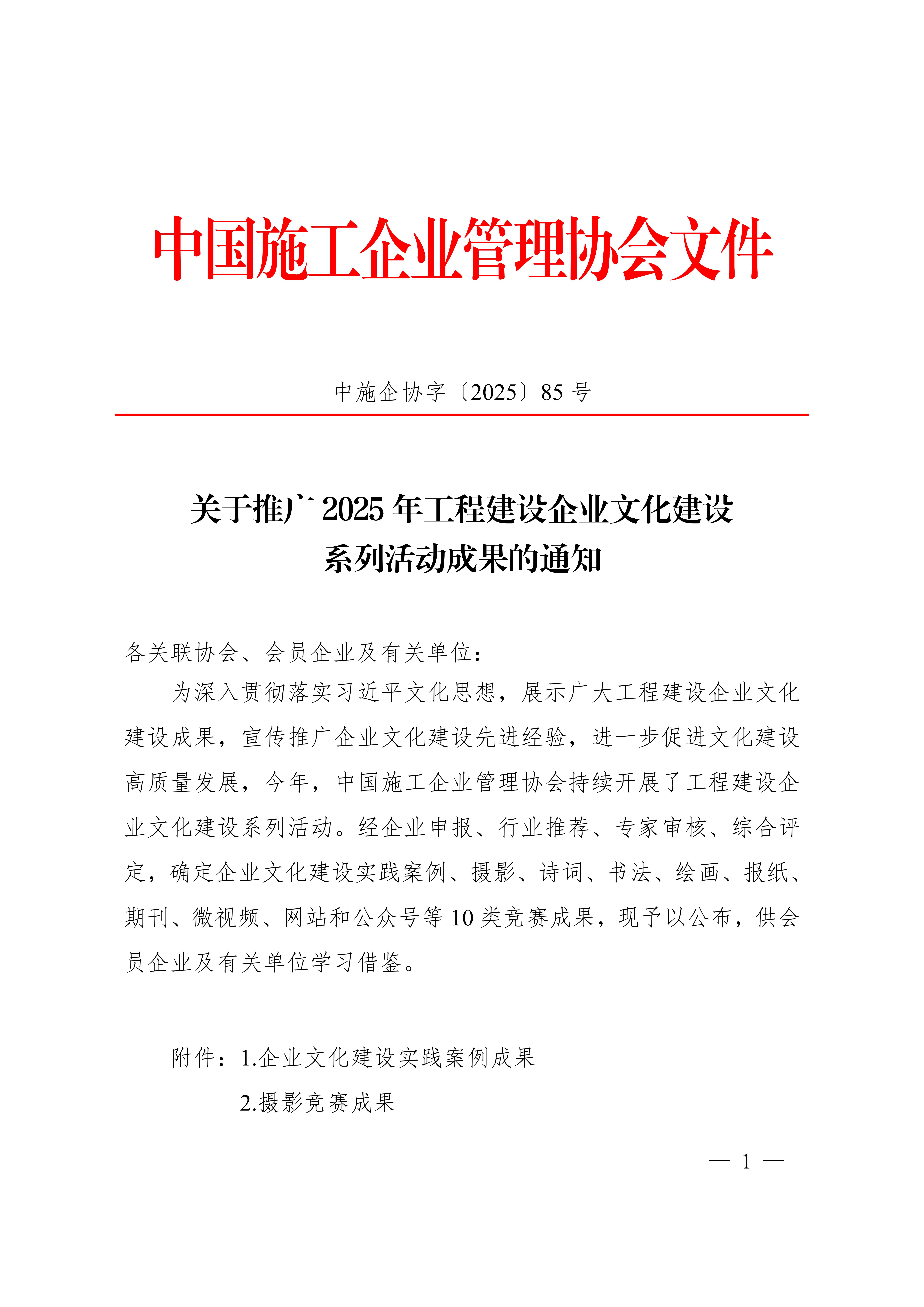 近日,中國施工企業管理協會印發《關于推廣2025年工程建設企業文化建設系列活動成果的通知》,公司《機安通訊》獲報紙競賽二等成果,《...